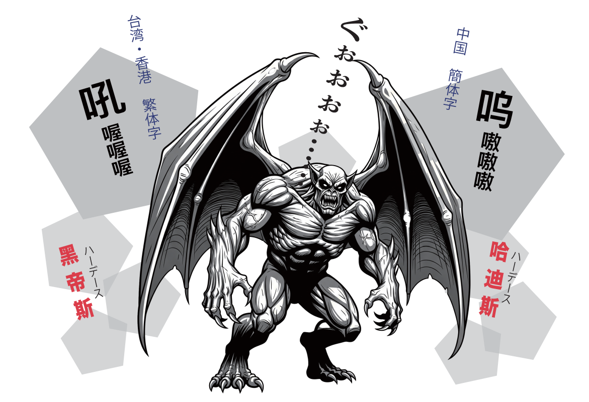 例えば、「ハーデース」というモンスターの名前を中国語にするとき、繁体字では「黑帝斯」簡体字では「哈迪斯」というように、用いる漢字自体が異なります。また「ぐぉぉぉぉ」という擬音語は、漢字だけでなく表現自体が異なってきます。こんな風に、中国語繁体字と中国語簡体字は文字だけでなく、言い回しなどが異なってくる場合が多くあります。
